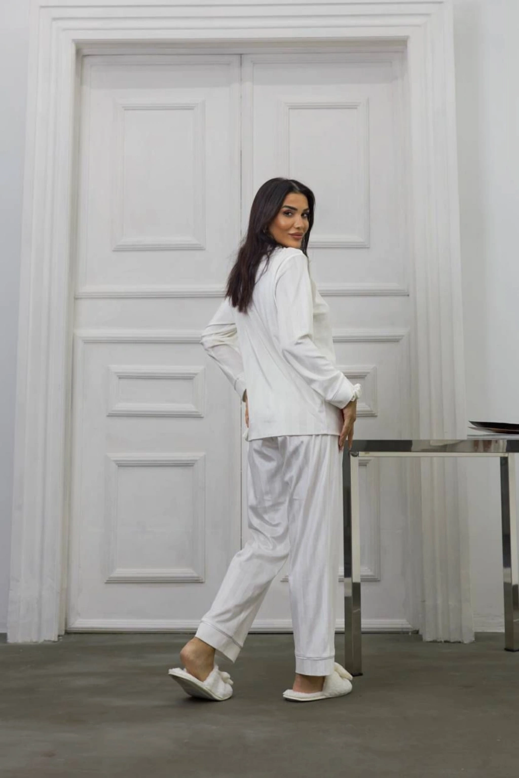 Beyaz Gofreli Kalp Nakışlı Uzun Kadife Pijama Takımı ile evinizde bir kraliçe gibi hissedeceksiniz.