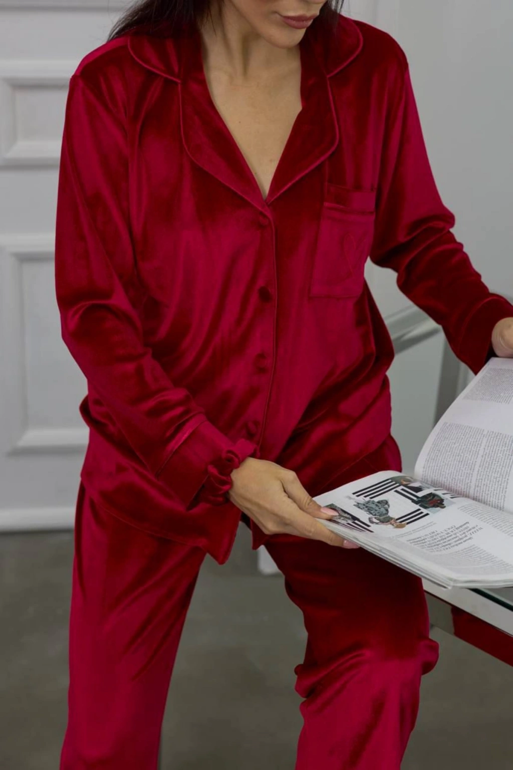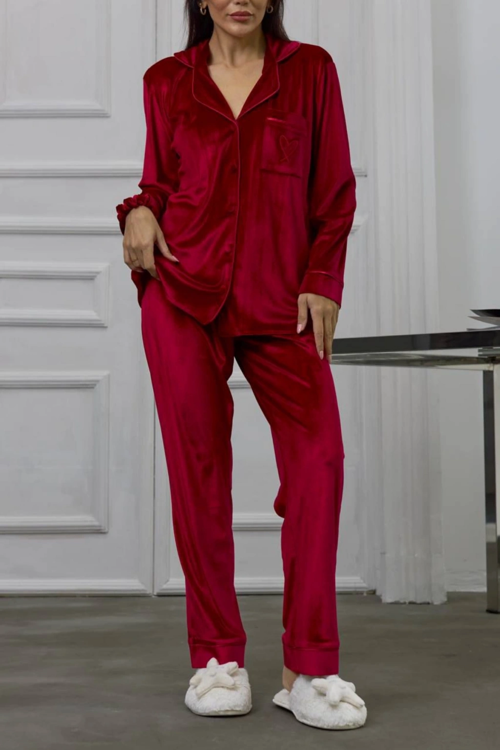 Kırmızı Gofrajlı Kalp Nakışlı Uzun Kadife Pijama Takımı ile evde geçirdiğiniz zamanları daha keyifli hale getirin. Şıklığı ve konforu bir arada yaşayın!