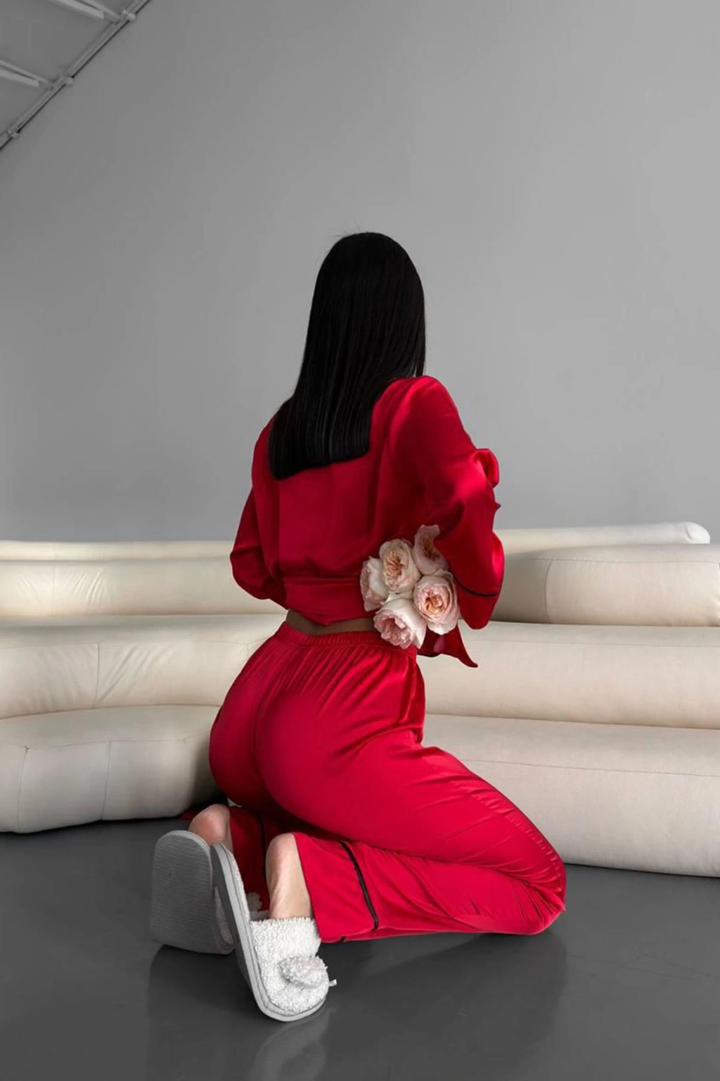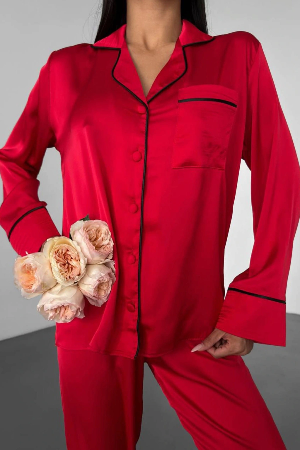 Love koleksiyonundan kırmızı düz uzun saten pijama, hem şıklığı hem de rahatlığı bir arada sunarak özel anlarınızı daha da anlamlı hale getiriyor. Yumuşak saten kumaşı, cildinize nazikçe dokunurken, göz alıcı kırmızı rengiyle zarafetinizi vurgular.