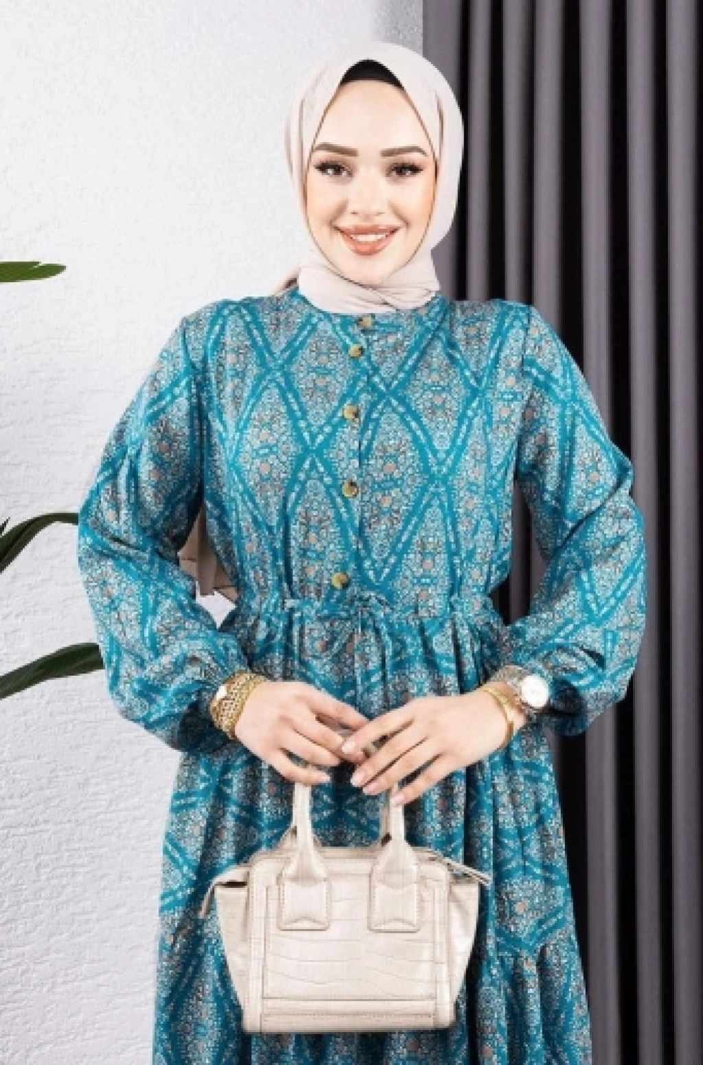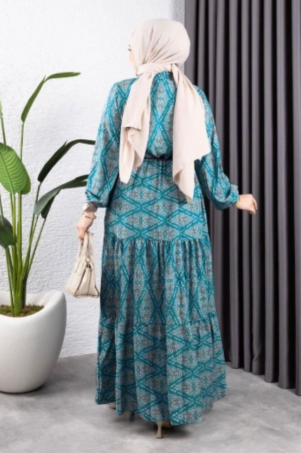 Bağcıklı Desenli Viskon Elbise YEŞİL