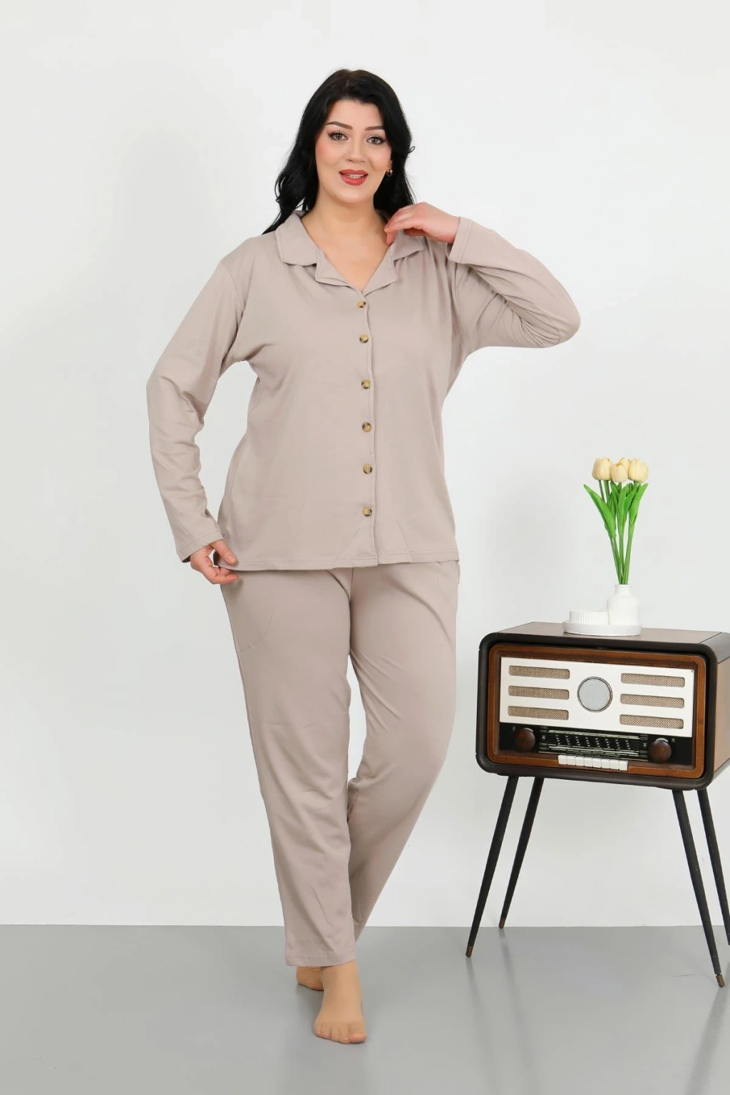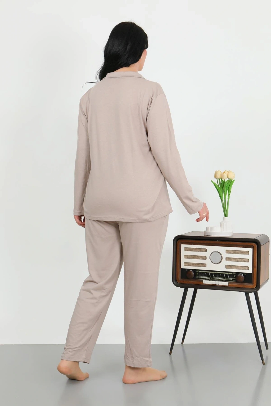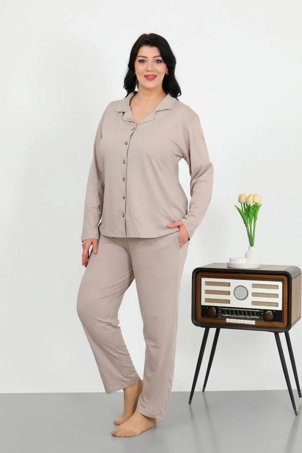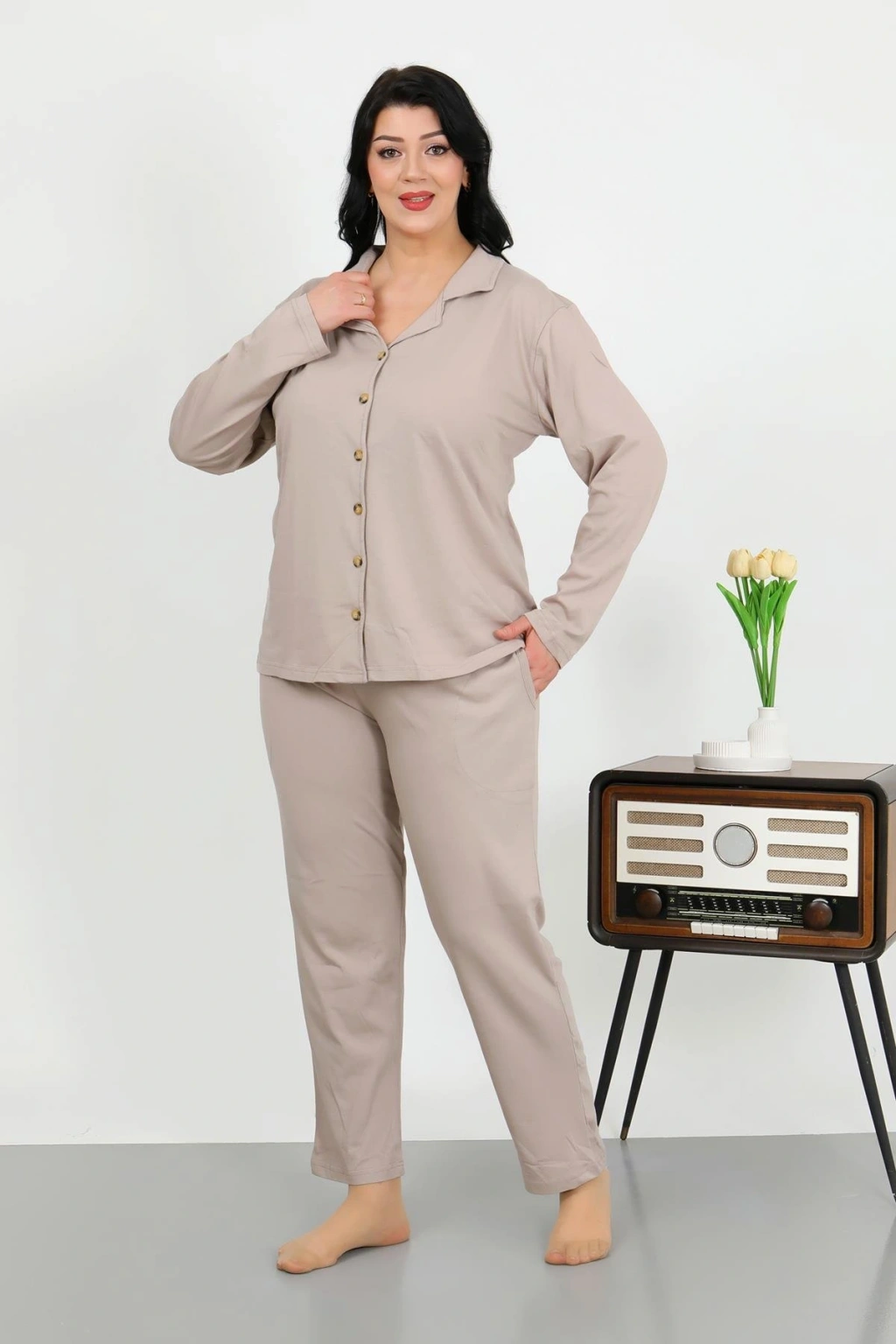 Moda Çizgi Kadın Pamuk Penye Önden Düğmeli Uzun Kol Pijama Takım Vizon 2783