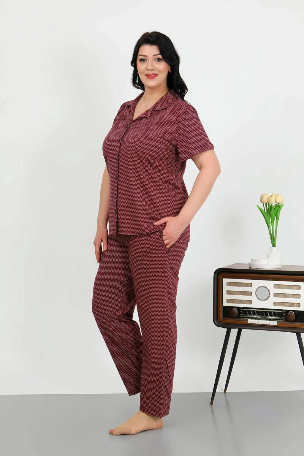 Moda Çizgi Kadın Büyük Beden Uzun Kol Penye Pijama Takımı Bordo 202501