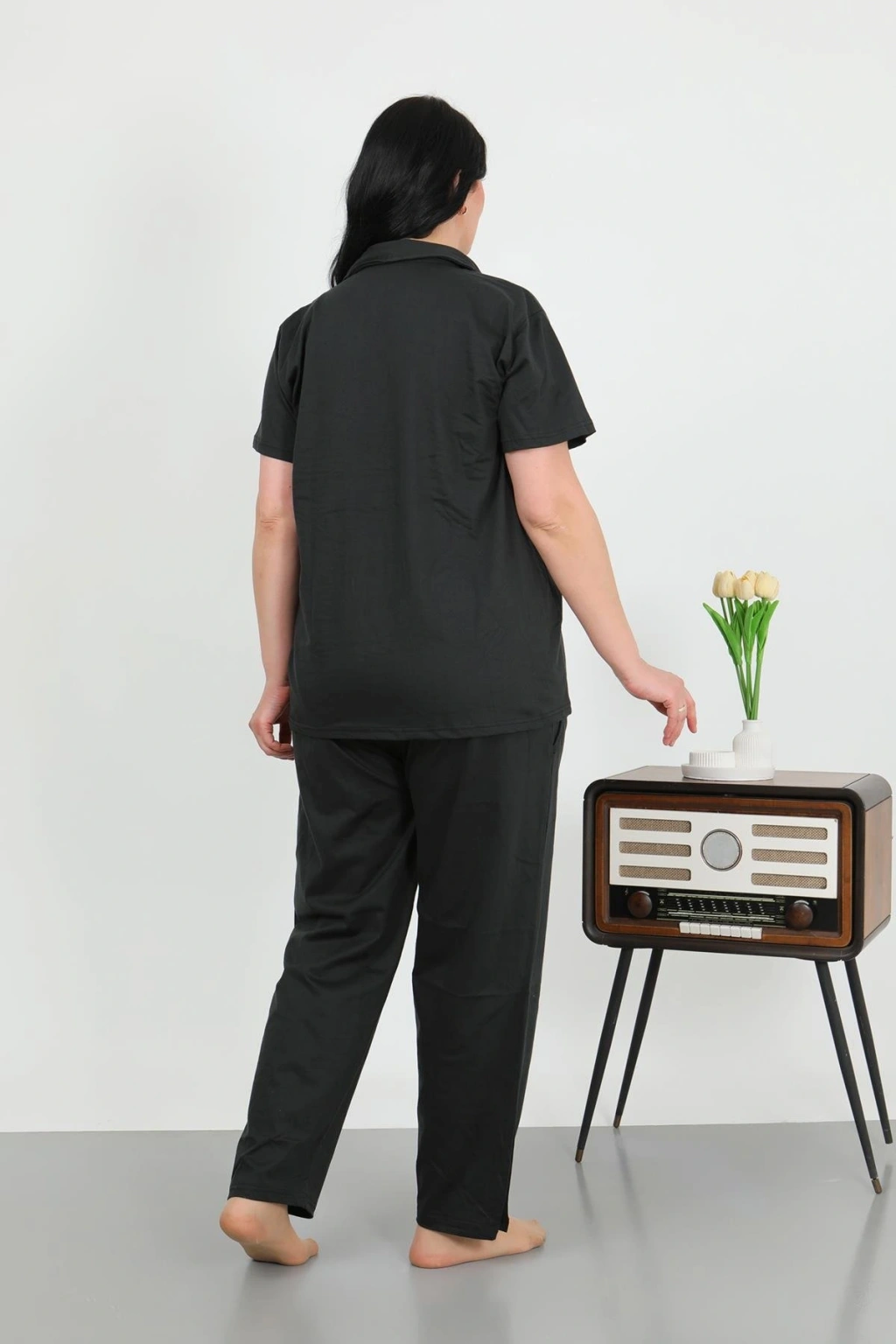 Moda Çizgi Kadın Büyük Beden Pamuklu Cepli Düğmeli Siyah Pijama Takım 202506