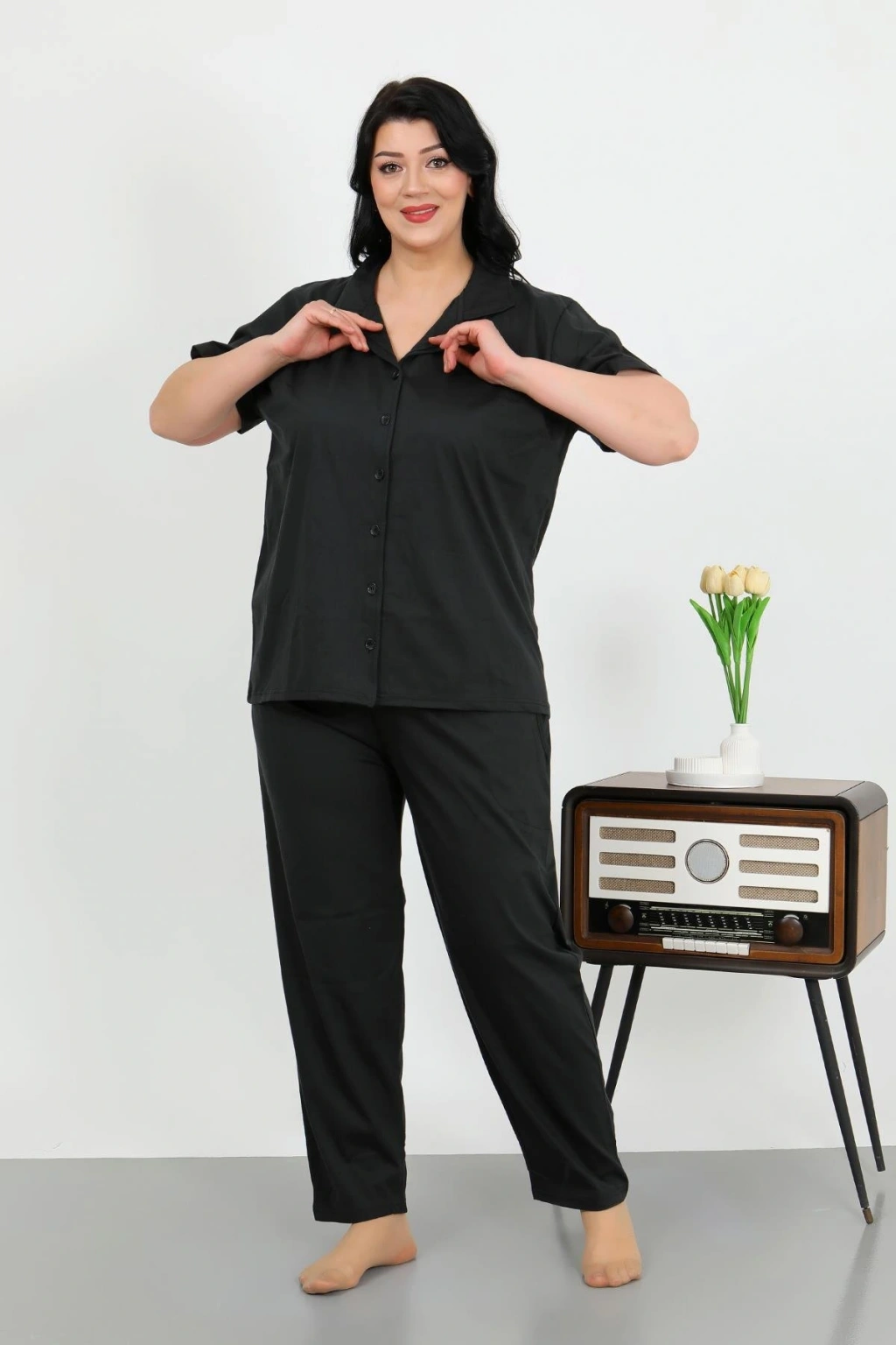 Moda Çizgi Kadın Büyük Beden Pamuklu Cepli Düğmeli Siyah Pijama Takım 202504