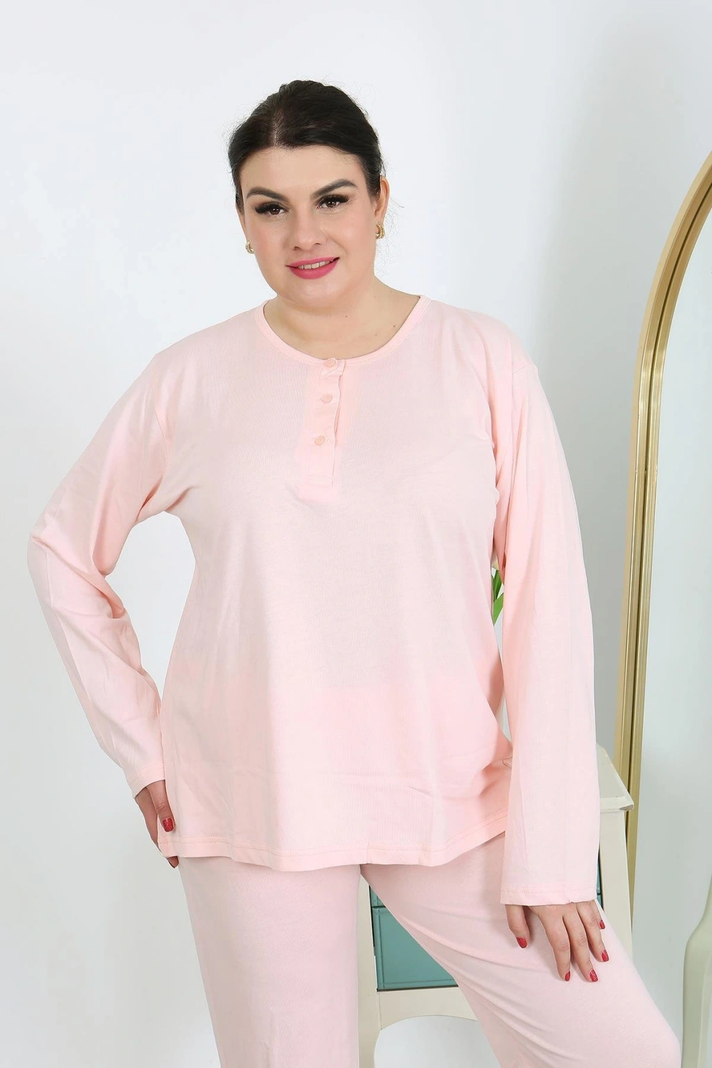 Moda Çizgi Kadın Büyük Beden Uzun Kol Penye Pijama Takımı Pembe 202501