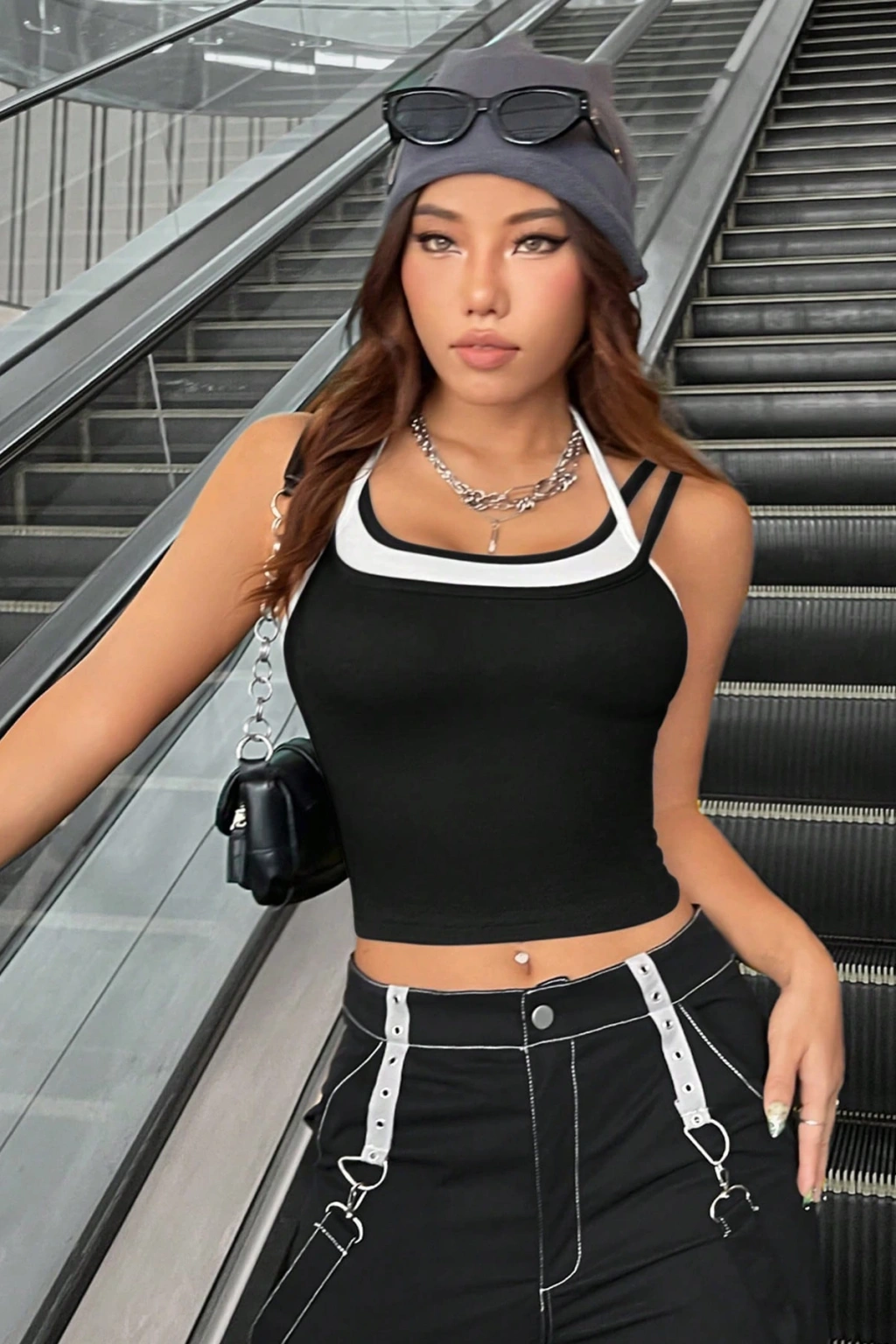 Kadın Beyaz Siyah Çift Renk Çapraz Askılı Crop Top Bluz