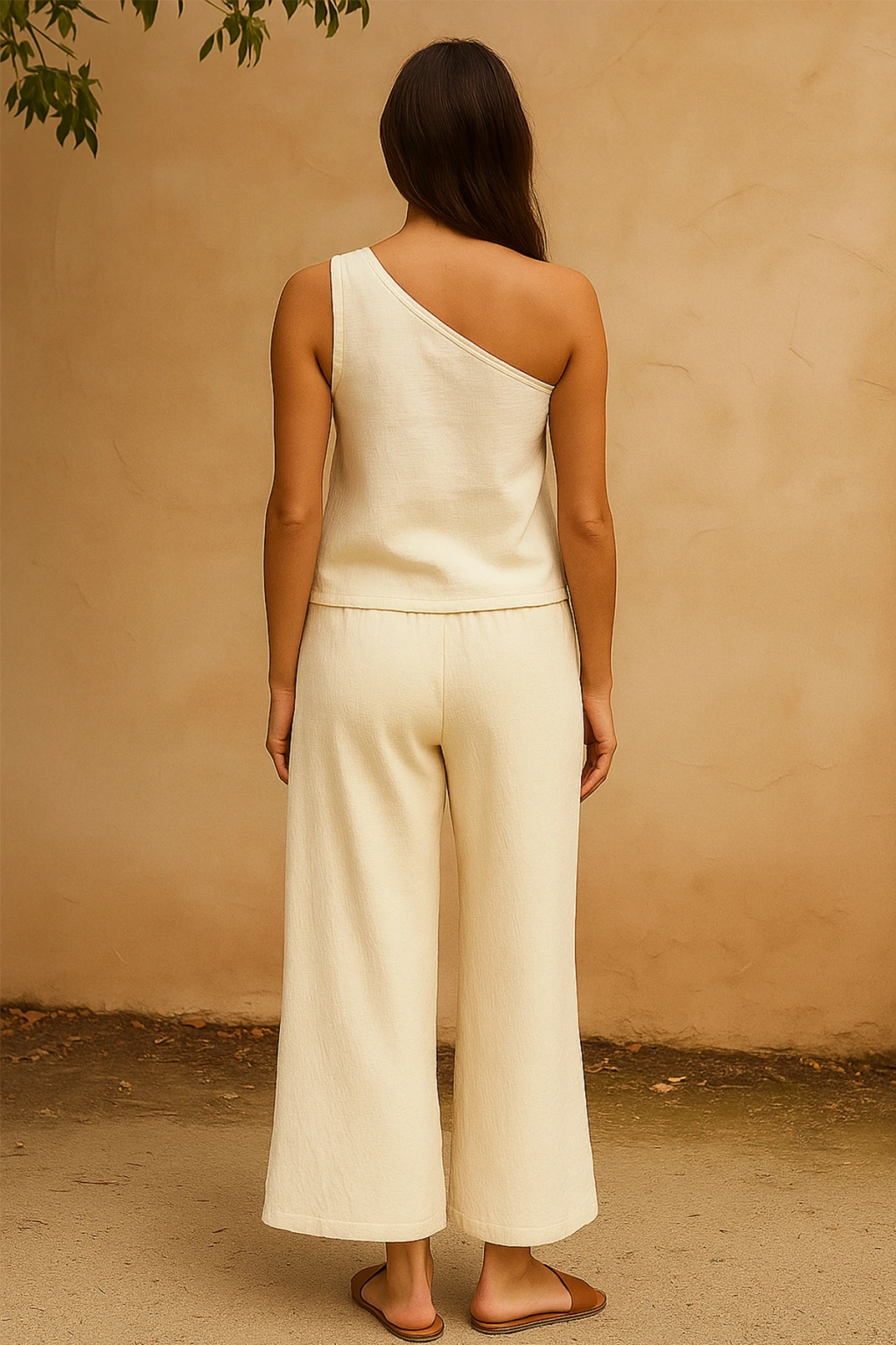 Kadın beyaz tek omuzlu bluz ve geniş paça pantolon ikili takım, zarif ve modern tarzı ile hem şık davetlerde hem de günlük kombinlerde rahatlıkla tercih edilebilecek özel bir parçadır.