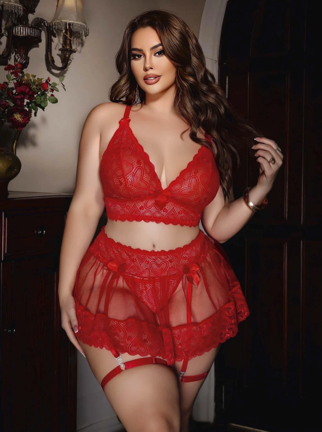 Kadın Büyük Beden Kırmızı Seksi Tasarım Fantezi Jartiyer Takımı 8016