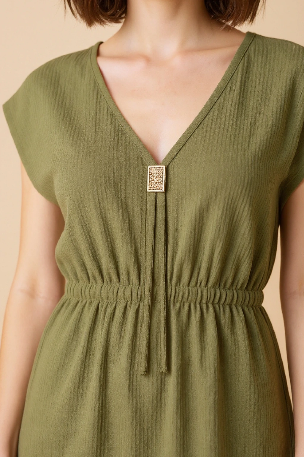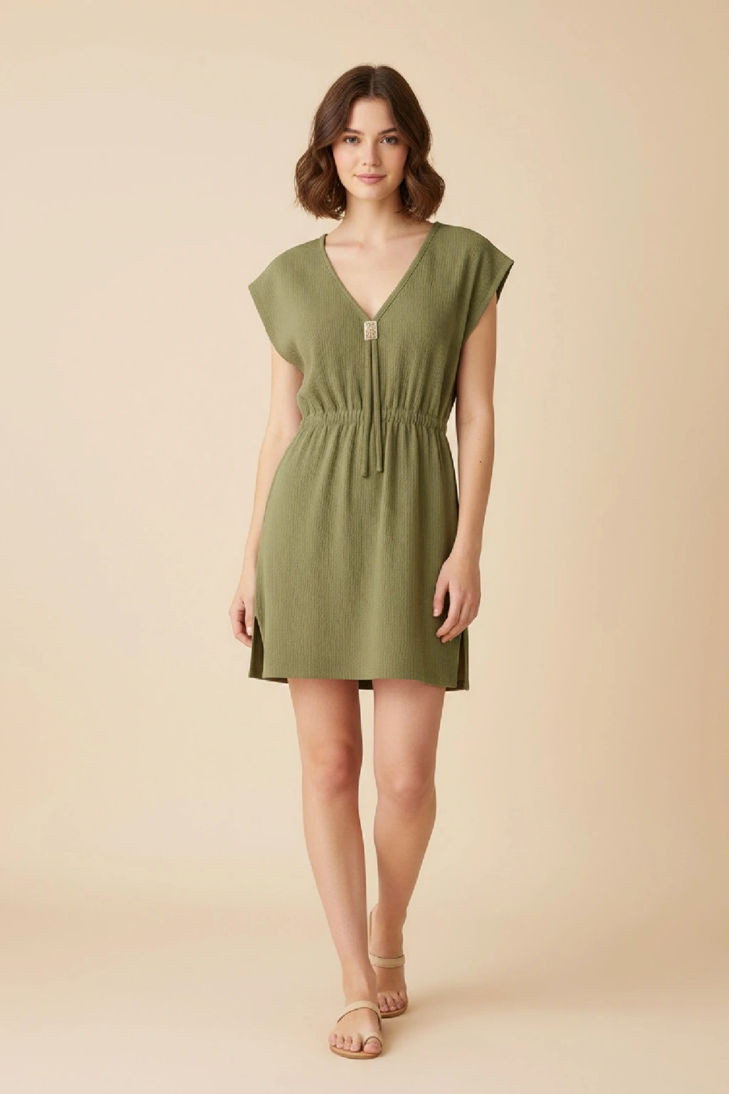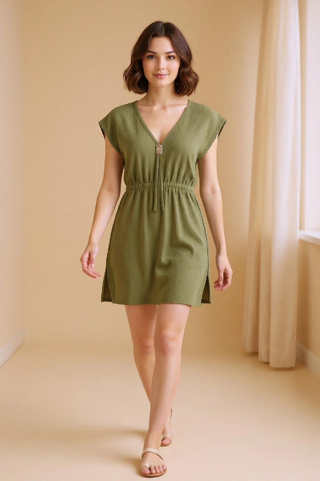Kadın Haki Yanları Yırtmaçlı Tokalı V Yaka Mini Plaj Elbisesi, doğanın huzur veren tonlarını modern bir tasarımla buluşturuyor.