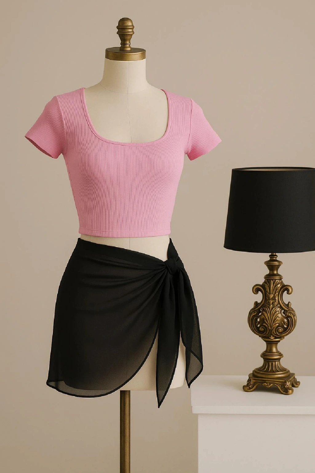 Kadın Pembe Yarım Kol Crop ve Siyah Pareo 2'li Set