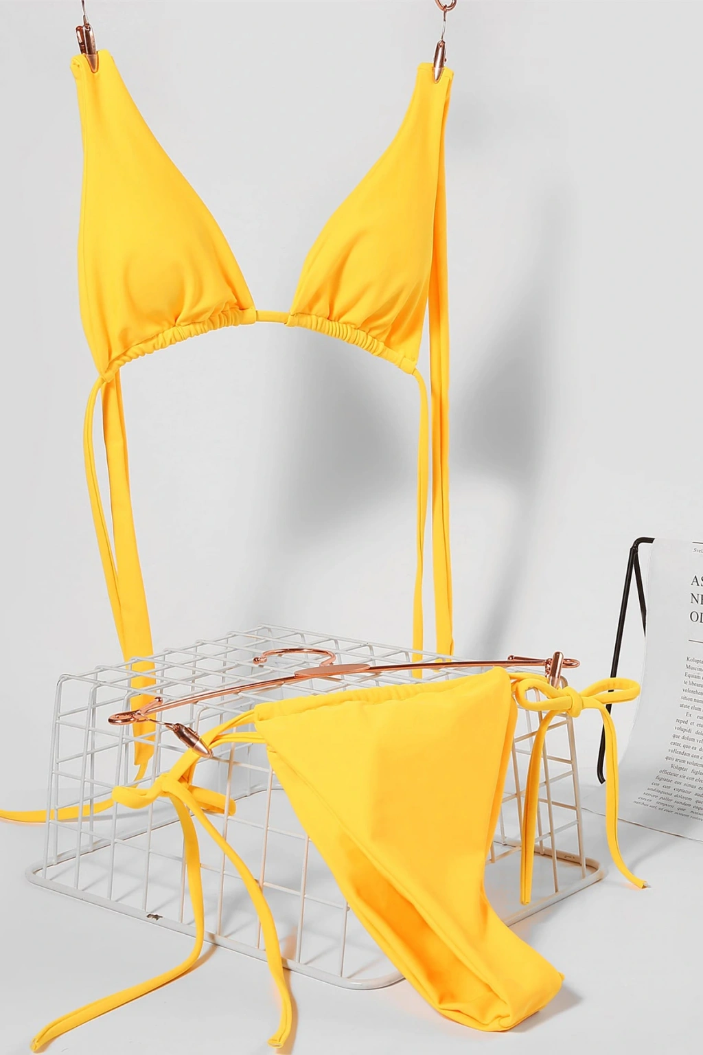 Kadın Sarı Yandan Bağlamalı Tangalı Üçgen Bikini Mayo Takımı