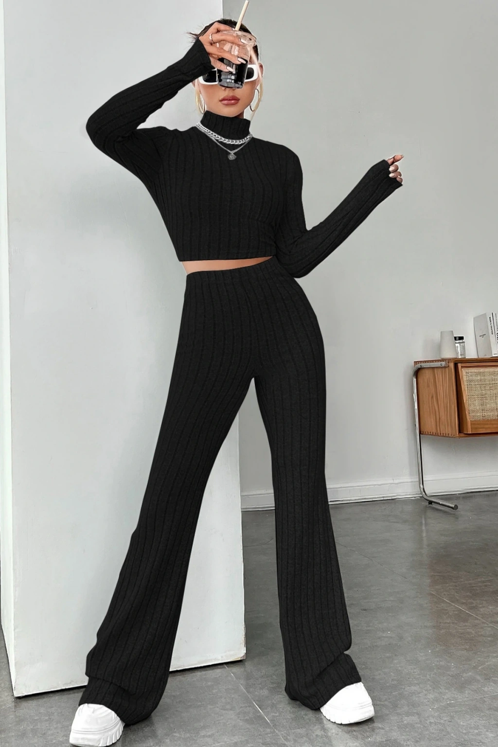 Kadın Siyah Boğazlı Crop Top ve Yüksek Bel Eşofman Takımı Spor Şık Kombin
