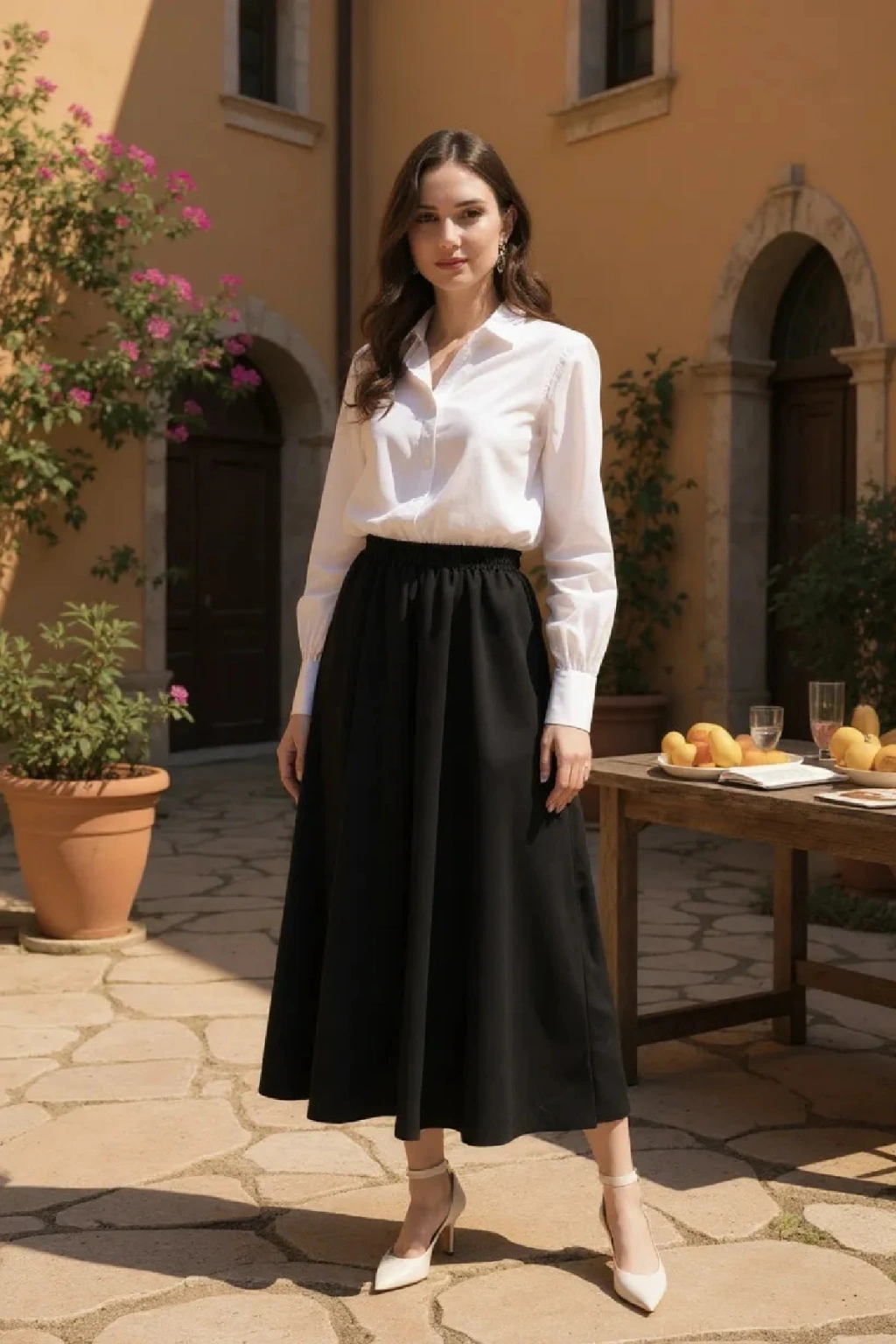 Klasik & Şık Kombin: Siyah eteği beyaz uzun kollu gömlek, ipek şal ve topuklu ayakkabı ile kombinleyerek davetlerde sofistike bir görünüm elde edebilirsiniz.