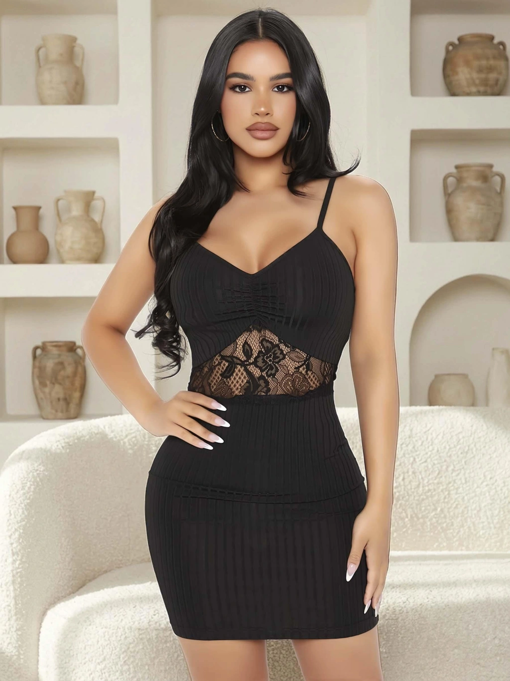 Kadın Siyah Zarif Kolsuz Elbise Seksi Dantelli Çiçek Desenli Fantezi Elbise 5149