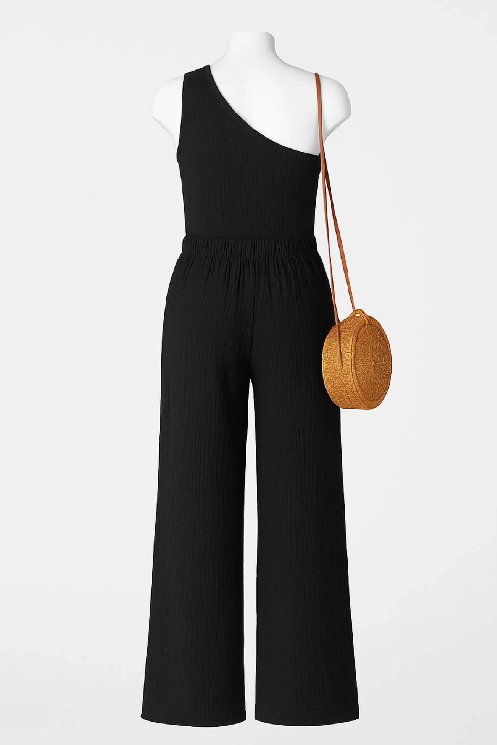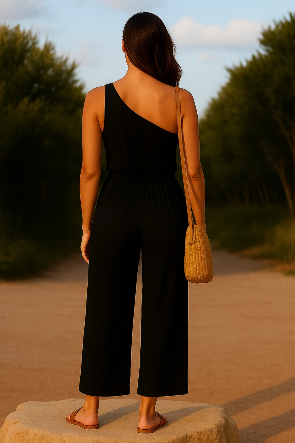 Kadın siyah tek omuzlu bluz ve geniş paça pantolon ikili takım, şıklığı ve rahatlığı aynı anda yaşamak isteyen kadınlar için ideal bir seçimdir.