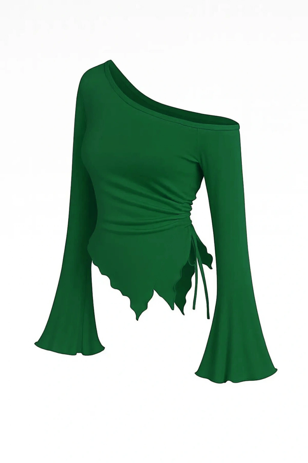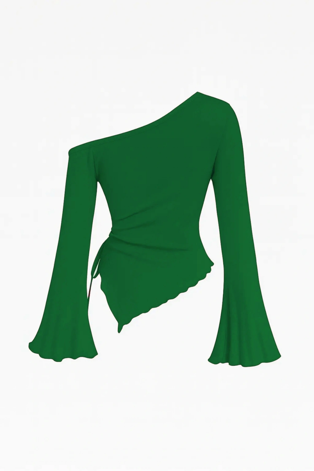Kadın Yeşil Asimetrik Yaka Drapeli Yan Bağlamalı Bluz, doğanın huzurunu ve modern zarafeti buluşturuyor.