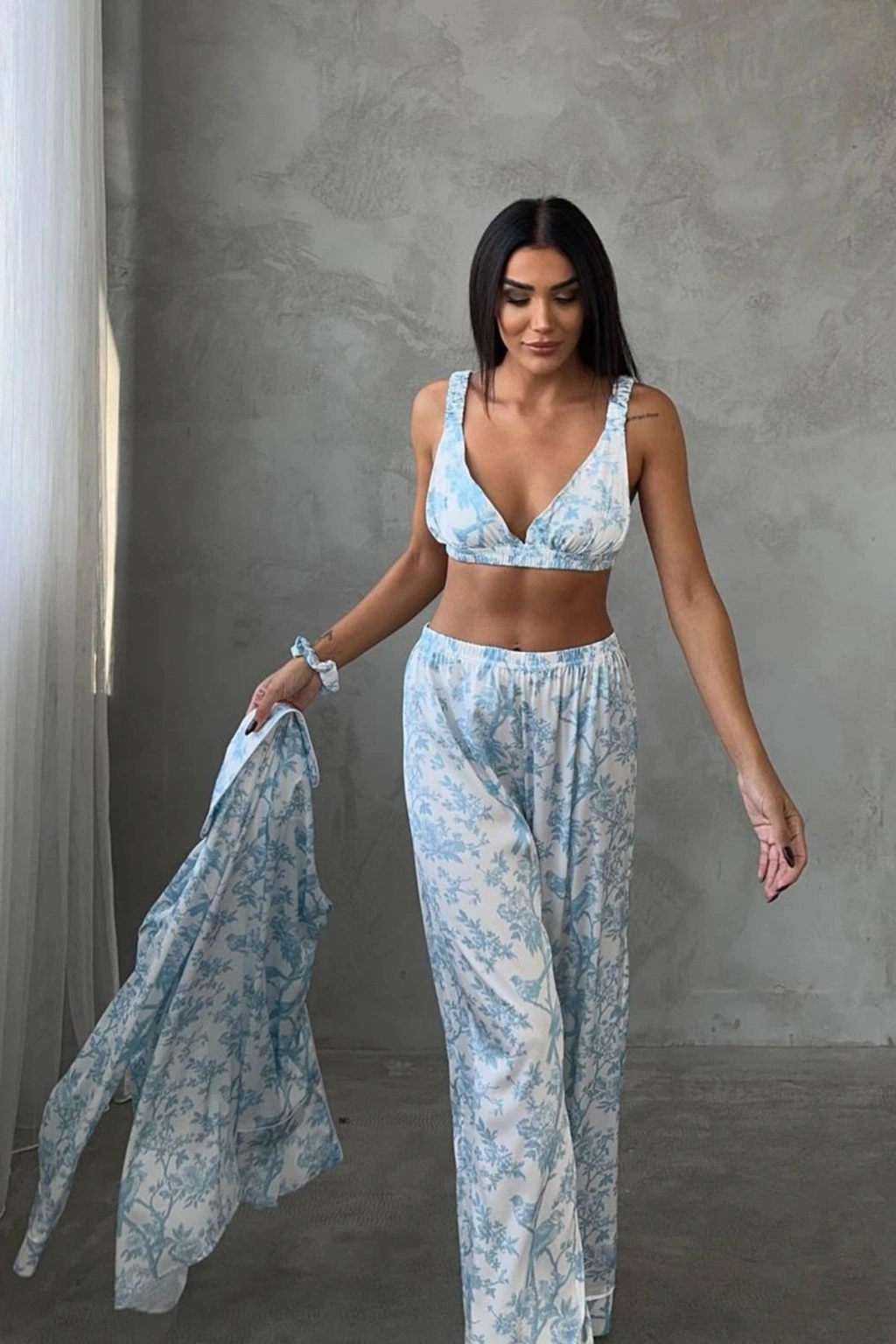 Zarafeti ve konforu bir araya getiren Mavi Kuş Dijital Baskılı Uzun Saten Üçlü Pijama Takımı, hem ev giyiminizde şıklığı hem de rahatlığı ön planda tutanlar için özel olarak tasarlandı. Yumuşak dokusuyla cildinizi şımartan saten kumaşı, lüks hissiyatı ile sizi buluşturuyor.