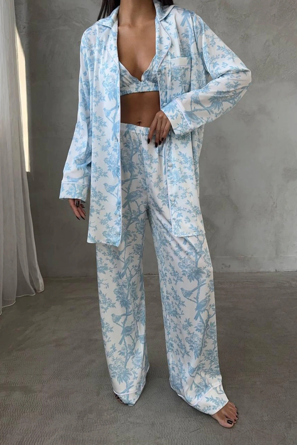 Lüks ve konforun mükemmel birleşimini yaşamak istiyorsanız, Mavi Kuş Dijital Baskılı Uzun Saten Üçlü Pijama Takımı tam size göre! Gecelerinizin en şık eşlikçisi olmaya hazır.