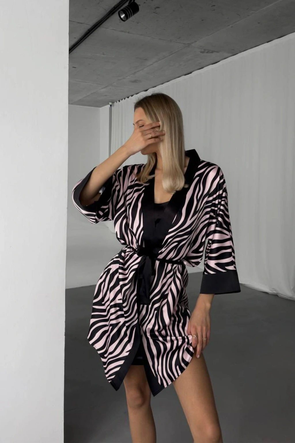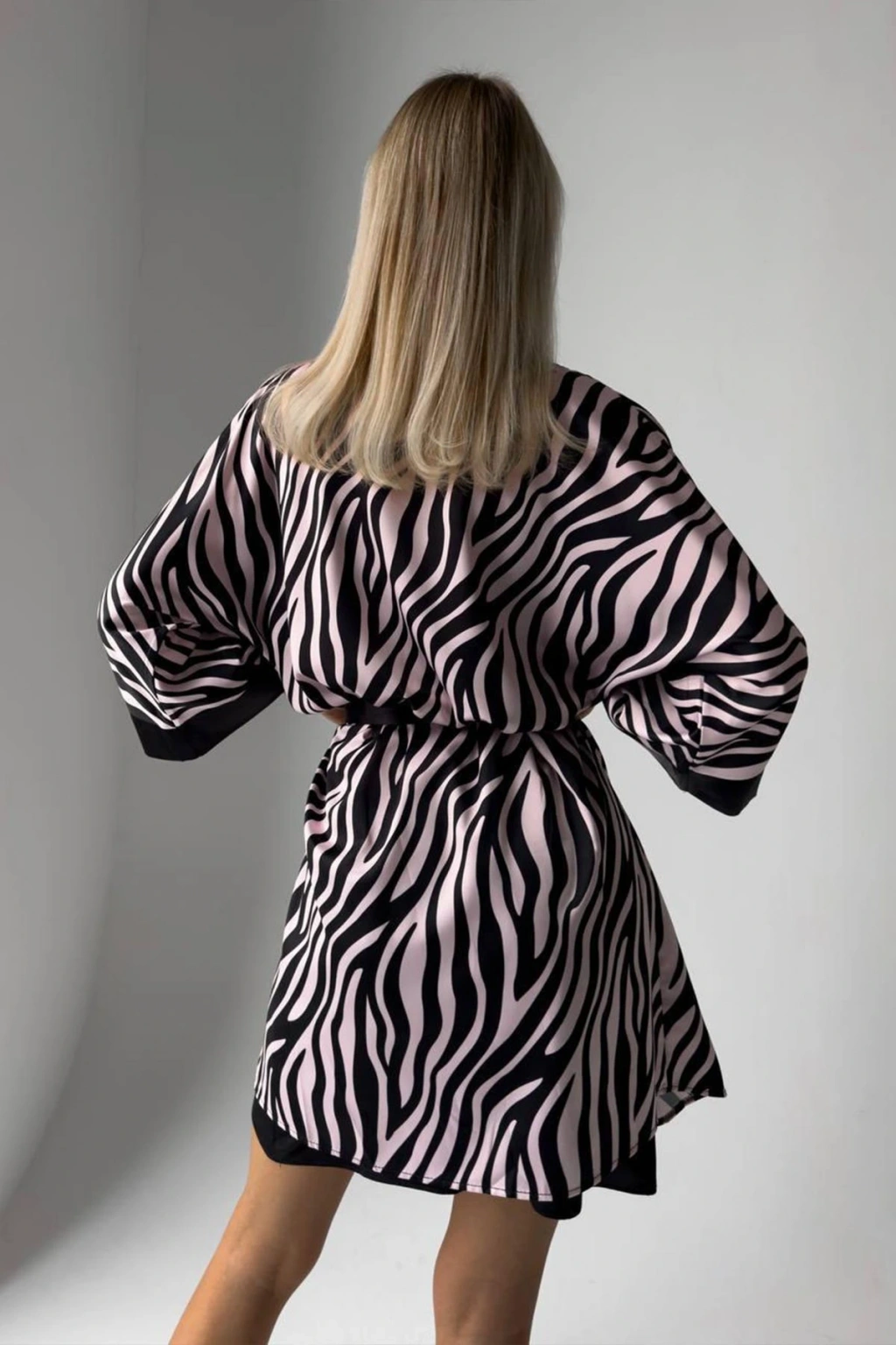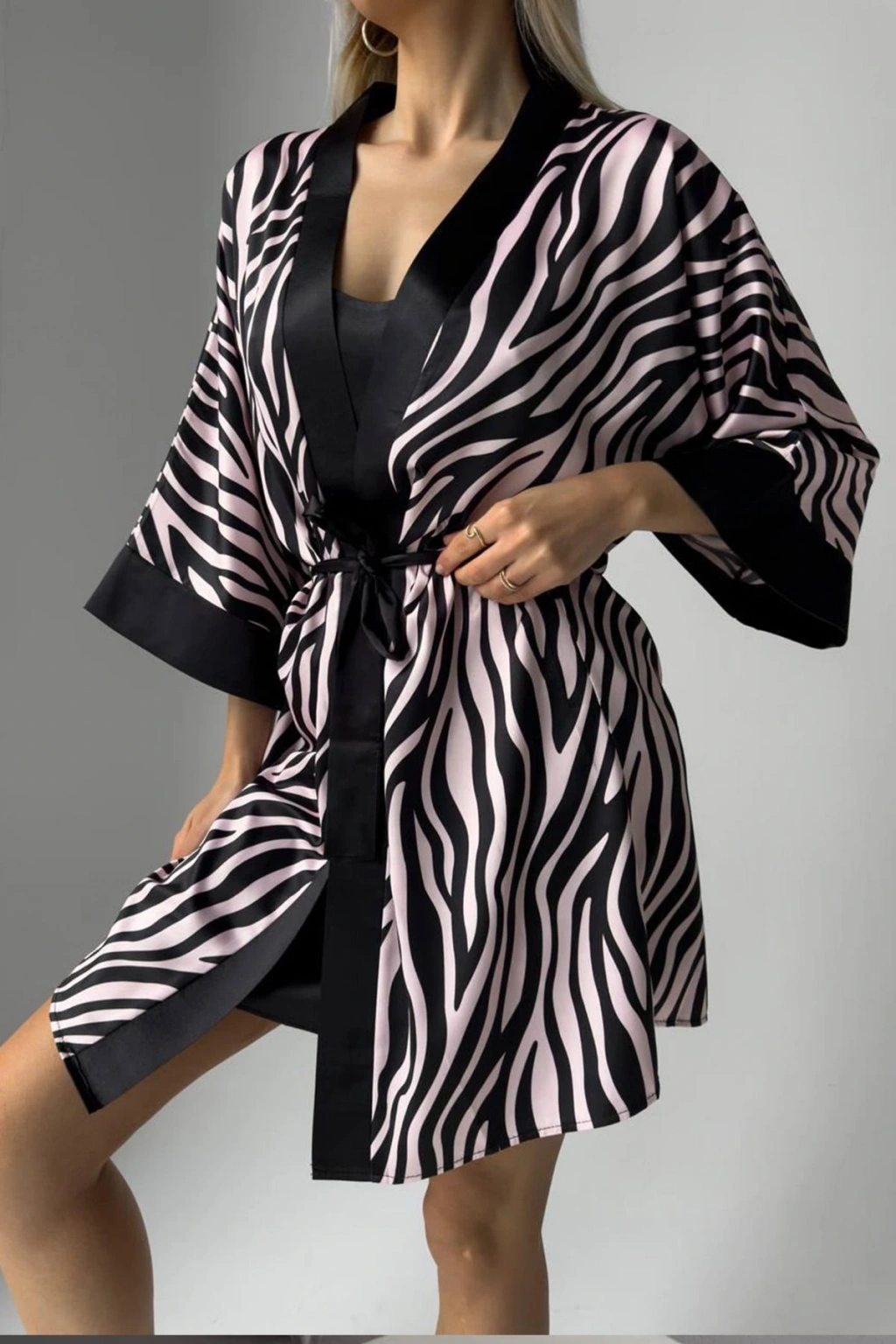 Doğanın vahşi güzelliğini feminen zarafetle birleştiren bu özel set, pudra siyah leopar desenli gecelik ve sabahlıktan oluşuyor. Dijital baskı teknolojisiyle oluşturulan canlı desenler, ipeksi dokulu kumaşla birleşerek şıklık ve konforu bir arada sunuyor. Göz alıcı tasarımıyla ev giyiminize sofistike bir hava katacak bu set, özel hissetmek isteyen kadınlar için tasarlandı.