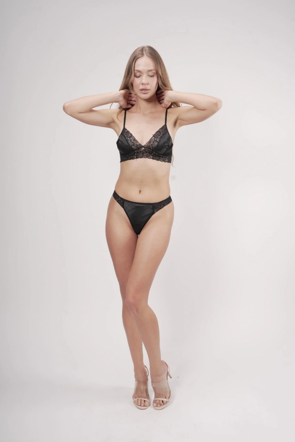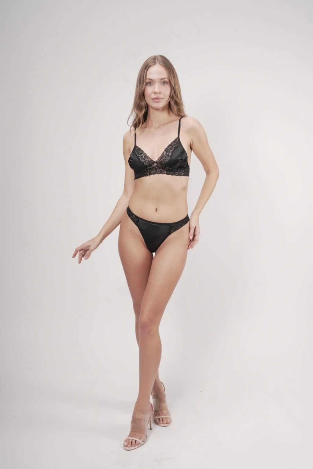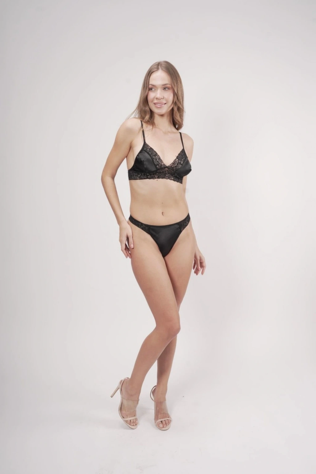 Satenin parlak dokusu ile ince dantelin zarafetini bir araya getiren bu takım, hem şıklığı hem de konforu aynı anda sunar. Göğüs formunu estetik şekilde kavrayan dantel detaylı sütyen, ayarlanabilir askıları sayesinde vücuda mükemmel uyum sağlar. Takımı tamamlayan siyah string ise esnek yapısı ve hafif dokusu ile gün boyu rahat kullanım sunar.
